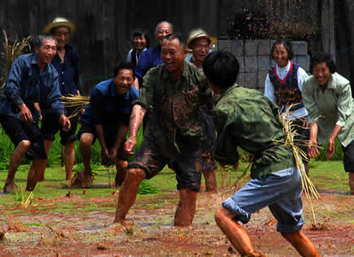 插秧活動(dòng)的最后一天,叫做“關(guān)秧門(mén)”。一丘田里,聚集了很多幫忙插秧的人,大家心里都憋著一股勁,看誰(shuí)秧插得最快。速度慢人往往會(huì)被插得快的人圍住,最后關(guān)在秧田中間出不來(lái),這叫“關(guān)豬籠”。這時(shí)候,速度快的人就會(huì)走上田埂,抓起稀泥團(tuán)朝被關(guān)了豬籠的人扔去,也有專(zhuān)門(mén)砸主人一身稀泥的,岸上也有人澆水。主人身上被砸的稀泥越多,主人越高興。在關(guān)秧門(mén)的最后時(shí)刻,人們會(huì)在田野里上演一場(chǎng)你追我趕的游戲,土家人把它叫做“糊倉(cāng)”。在“糊倉(cāng)”的過(guò)程中,誰(shuí)也不會(huì)記仇,大家你追我趕,場(chǎng)面極其熱鬧。