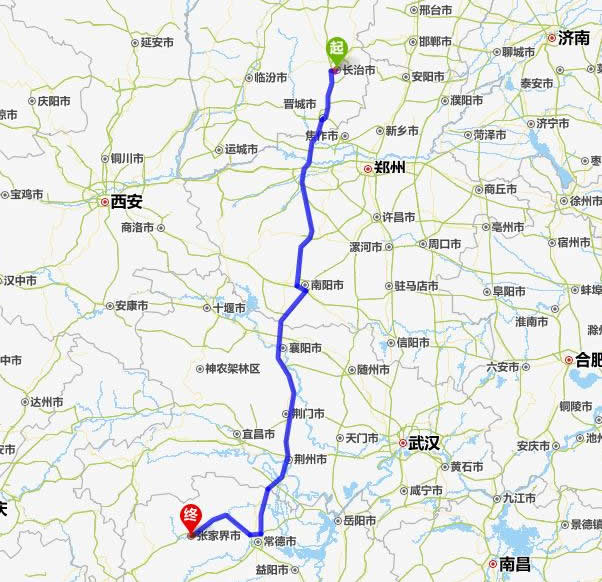 左右,沿途經過長治——焦作——南陽——襄陽——荊門——荊州——常德(也可以走國道經澧縣、石門縣)——慈利——張家界。