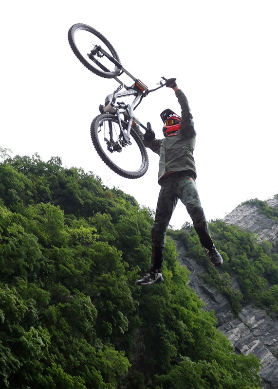 張家界天門(mén)山天門(mén)洞,999級(jí)臺(tái)階,以39°斜坡筆直往下,看一眼都覺(jué)得眩暈。如果有人騎著山地車(chē)一路沖下來(lái),你一定會(huì)說(shuō)“瘋了!”。